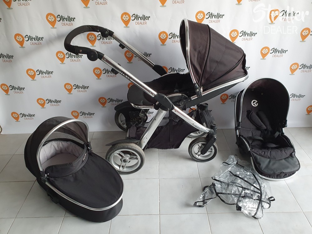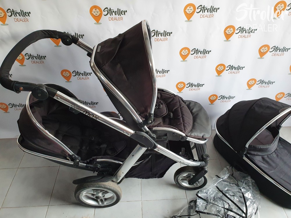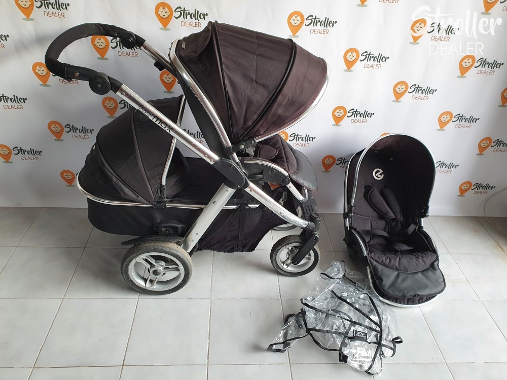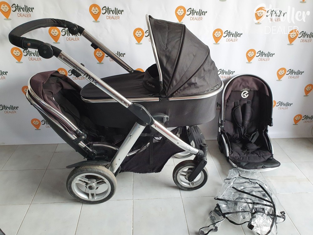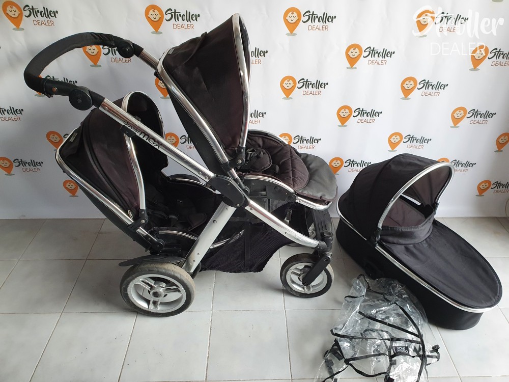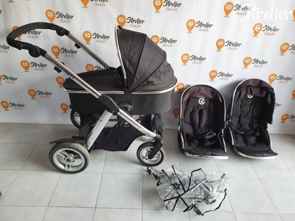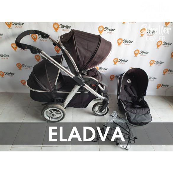 Szuper vétel, ha később terveztek kistesót is a nagyobbik gyerkőc mellé. Lehet egyszemélyes kocsinak is használni (nem foglal nagyobb helyet, mint egy másmilyen kocsi) és kétszemélyesnek is. Többféleképpen variálhatóak az ülések és a mózes elhelyezése. A babakocsi könnyen irányítható két gyermekkel is. A tolókar magassága állítható, kerekei tömörek. A szett tartalma: egy mózes, egy nagykupolás dönthető sportülés, egy nem dönthető sportülés + egy gyári esővédő a mózesre.